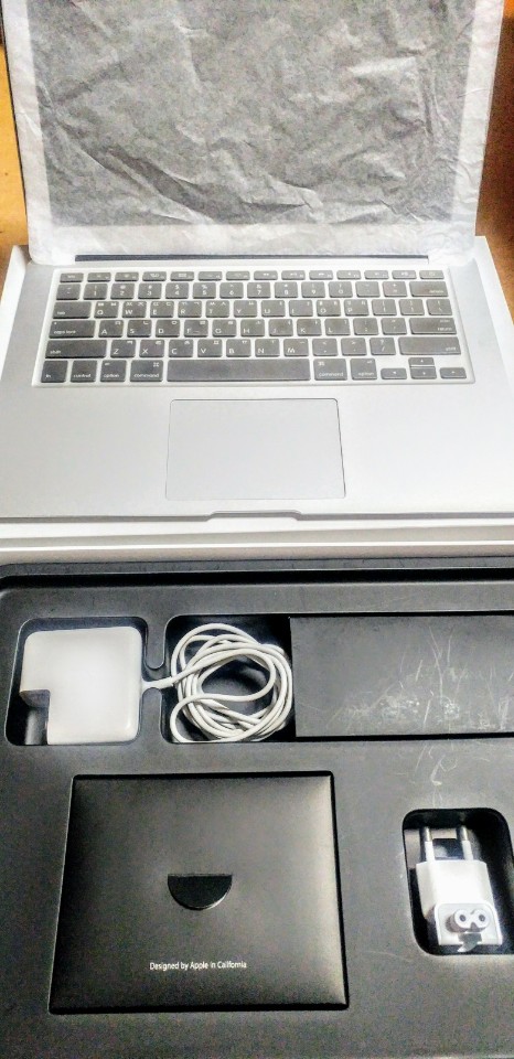 맥북 상자랑 충전기 풀박스 입니다. 실제 맥북 새 제품 구매하신거랑 다름 없을 정도로 풀 박스 상태 Good