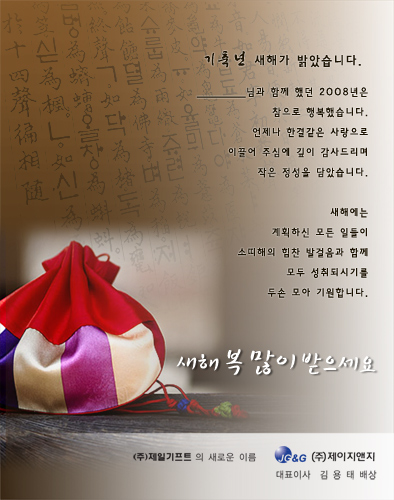 그냥...복주머니와 바탕을 따로 넣지말고.. 복주머니를 예쁘게 따시고... 바탕을 회색+갈색으로 하기보단.. 바탕을 복주머니의 바탕색(약한 미색?)을 미색+갈색그라데이션으로 처리하면 좀더 자연스럽지 않을까 싶어요...